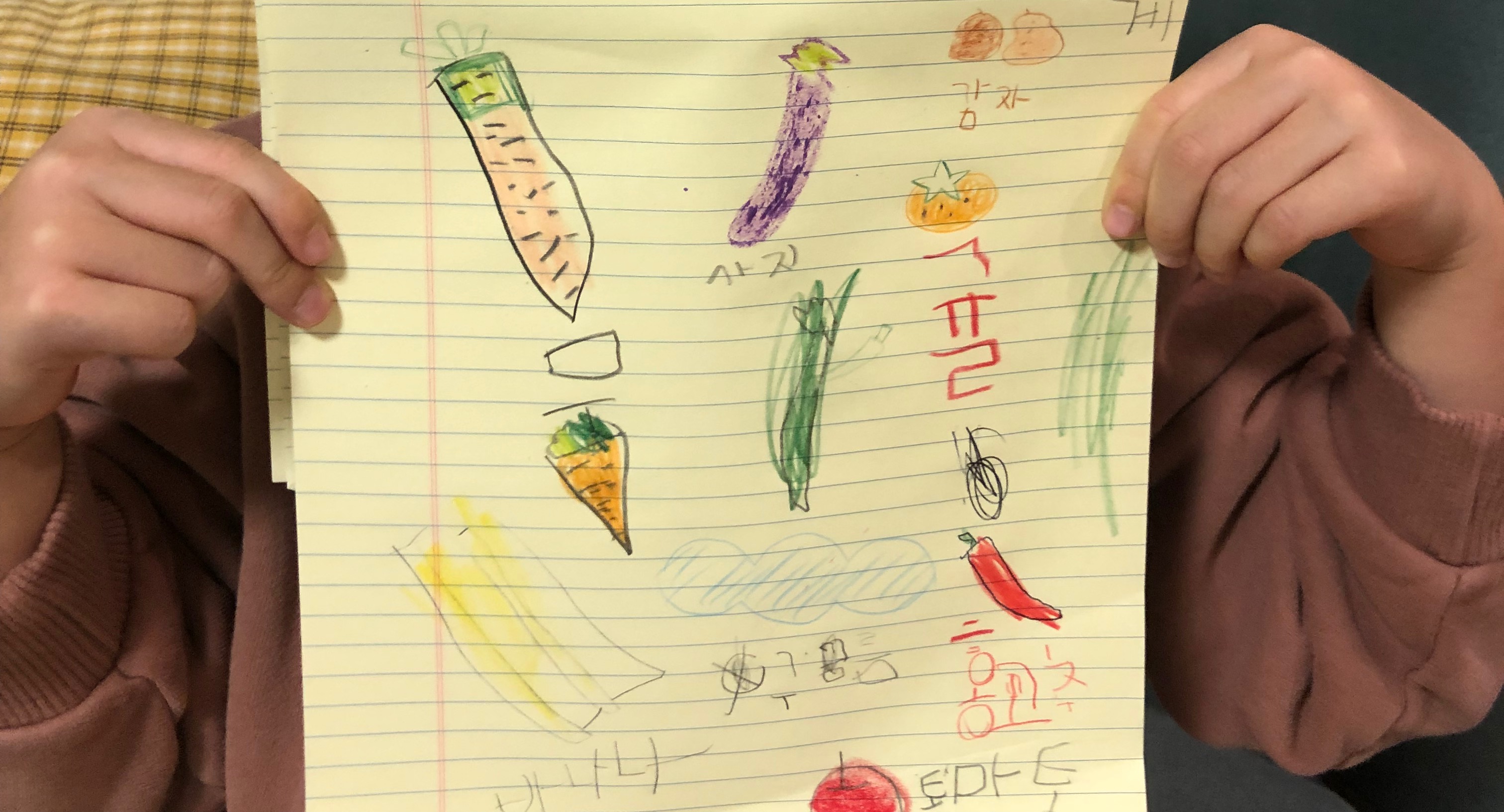 수업중에 아이와 함께 한 활동인데요. 아이와 야채나 과일 그림을 함께 그려보고 맞춰보는 놀이를 했는 유치원 아이들은 이러한 놀이를 굉장히 좋아하는 거 같아요. 그림도 그리고 색칠도 칠하고 함께 문제도 내보고 서로 번갈아가며 맞춰보며 상호작용하는 시간을 가졌는데 굉장히 의미 있는 시간이기도 했어요.