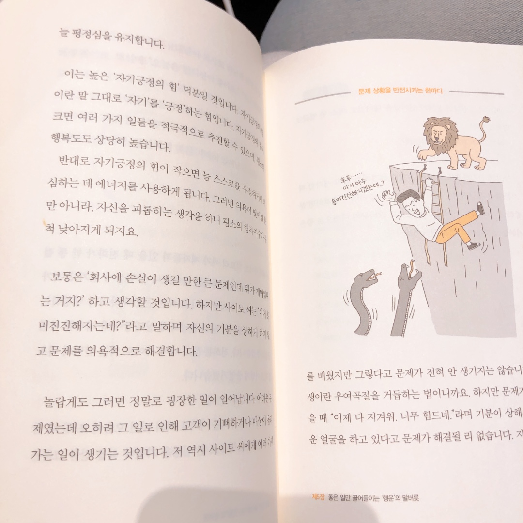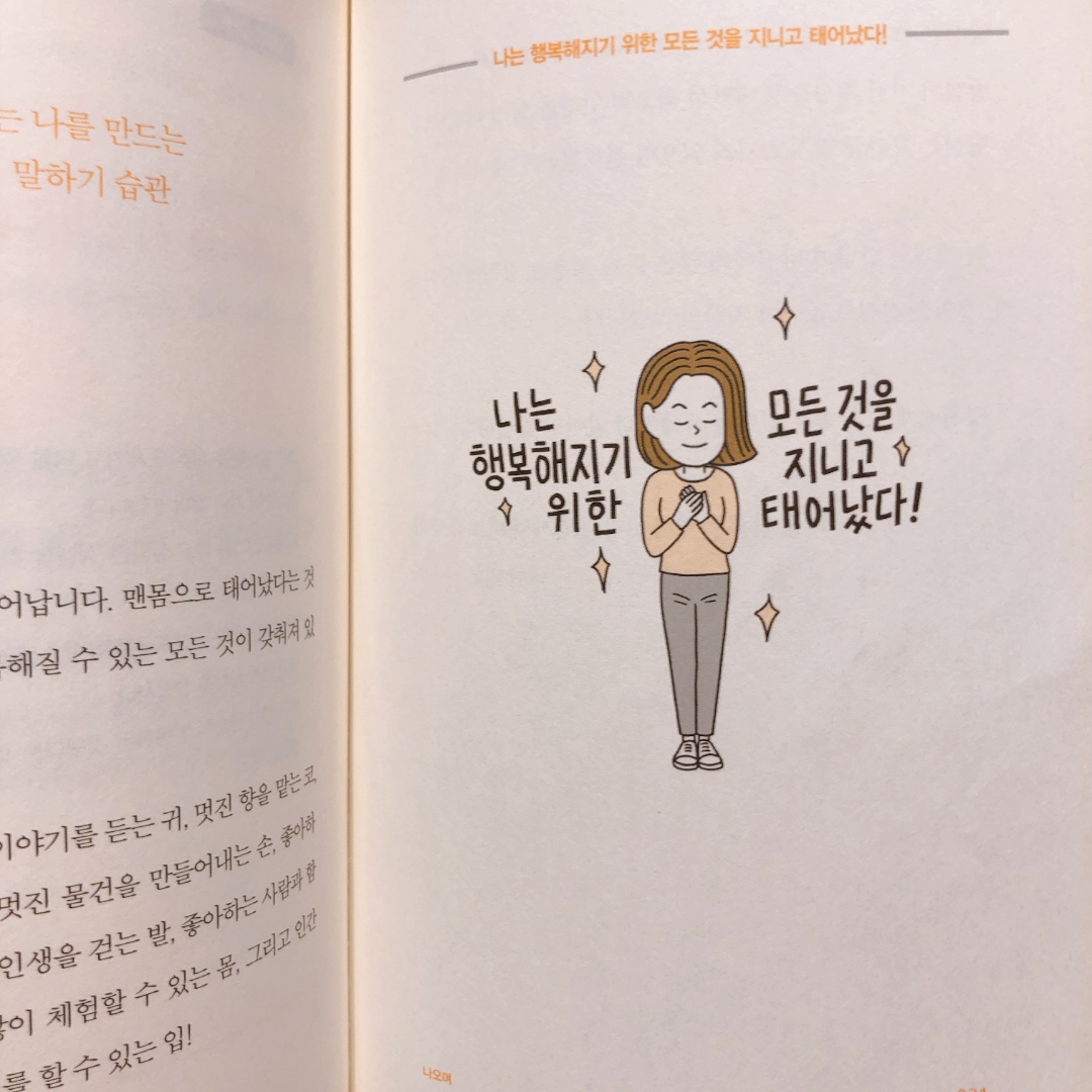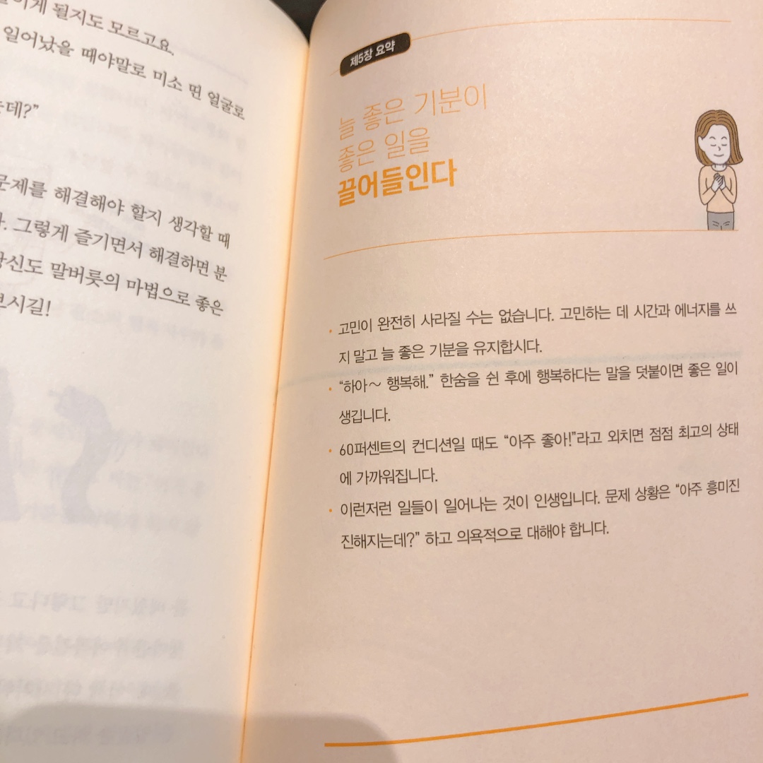 나도 모르게 한숨이 쉬어나올 때 하아~ 휴.. 행복해라는 말을 덧붙여서 언어의 반전을 일으키는 것. 이 부분이 상당해 재밌게 읽혔는데요. 책을 읽고 나서 나도 모르게 한숨을 쉬고 휴.. 행복해라고 말한 적이 있는데 부정적인 기운을 뭔가 반전시킨 것 같다는 느낌을 받았던 적이 있어요. 이 글을 읽으시는 분들도 한숨이 새어 나올 때 휴우.. 뒤에 반전의 긍정 언어를 섞어서 뱉어보세요 그날의 느낌을 내가 주도적으로 가져올 수 있답니다.