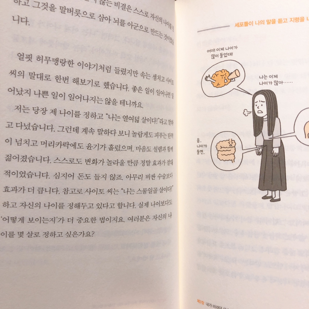저는 30대의 나이지만 앞으로 점점 나이가 들수록 나는 열여덟 살이다라는 마음가짐으로 살아가야겠다고 생각하게 된 대목이에요. 내가 하는 말을 통해 나의 세포가 듣고, 내가 행동하게 된다는 것. 실제 연구사례에서도 50,60대를 대상으로 자신의 가장 황금기인 20,30대의 지냈던 곳의 환경을 조성해서 그 사람이 행동하게끔 했을 때 실제 그 실험에 참가한 사람 대부분이 실제 나이보다 신체나이가 10살은 젊어졌다는 연구결과를 본 적이 있어요. 이러한 연구결과는 우리의 생각과 말이 얼마나 중요한지를 여실히 보여주는 대목인 것 같아요.
