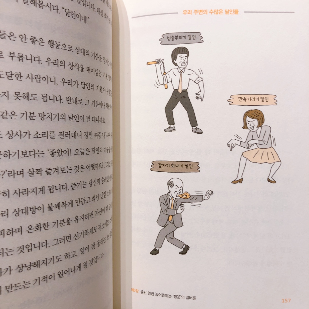 나를 불쾌하게 만드는 사람들에게 달인이라는 이름을 붙여주면 좋다는 내용인데요. 저도 얄미운 사람이 있어서 얄밉기 달인, 무책임달인, 이런식으로 이름을 붙여 생각했더니 웃음이 새어 나오면서 무책임한 사람에 대한 부정적인 이미지가 우스꽝스럽게 연출되어 짜증 나는 기분이 반감된 경험이 있어요. 이런 방법은 처음이었는데 일상생활에서 적용해서 사용해 보니 실제로 도움이 되는 것 같으니 나를 괴롭히는 사람이 있다면 아무개 달인으로 이름을 붙여보세요 ㅎㅎ
