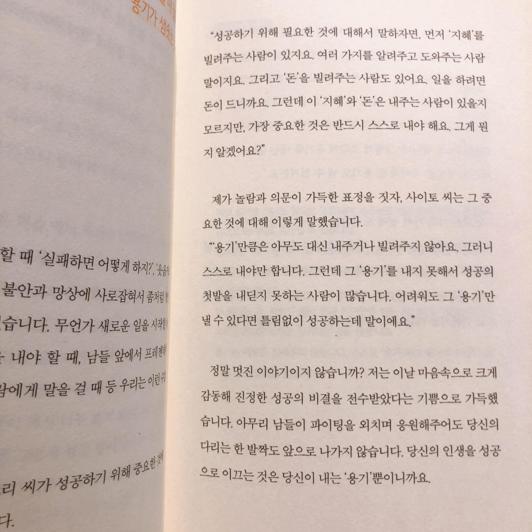 남들의 응원과 더불어 스스로 해야할 것이 바로 용기라는 것이라고 해요. 용기가 없다면 어떠한 일도 행동으로 옮기기가 쉽지 않으니 사이토 씨가 그렇게 말한 거라는 생각이 들었는데요. 어떠한 일을 시작하고, 중단할 때 모두 용기가 필요하듯이 우리 인생에서 어떠한 결정을 내리든 그대로 유지하든 모든 것에는 용기가 필요하다는 말은 맞는 말 같아요.
