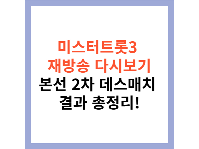 TV조선의 인기 오디션 프로그램 ‘미스터트롯3’ 6회가 방송되며 시청자들의 관심이 집중되었습니다. 본선 2차 1:1 데스매치 무대가 펼쳐졌고, 치열한 경쟁 끝에 승리한 참가자들이 본선 3차로 진출했습니다. 또한, 3주차 대국민 응원투표 순위도 공개되며 트롯 팬들의 관심이 더욱 높아졌습니다. 이번 포스팅에서는 ‘미스터트롯3’ 6회 재방송 다시보기 방법, 3주차 투표 결과, 본선 2차 데스매치 결과, 편성표 등을 살펴보도록 하겠습니다.