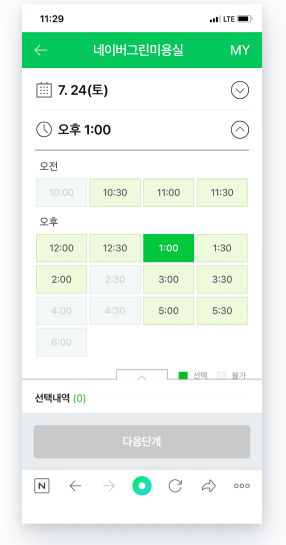- 시간을 선택한 후, 예약 옵션(컷, 염색, 펌 등)을 고릅니다.