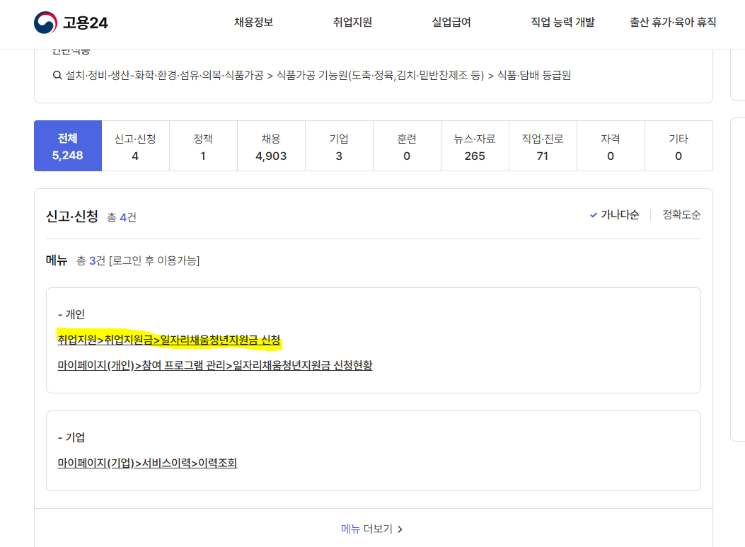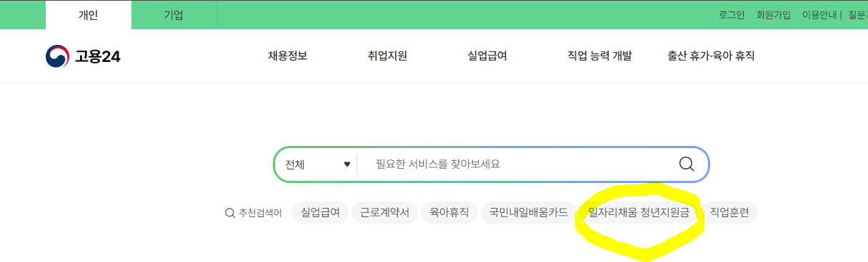 ** 아래 고용 24 홈페이지에 접속해서 검색창에 일자리채움 청년지원금 검색, 추천검색어에 나와 있어서 해당 키워드를 클릭해도 됩니다.