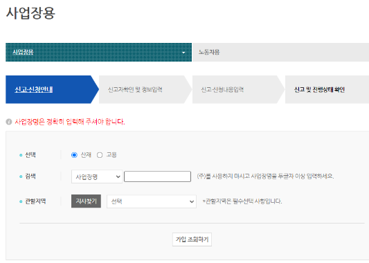 조회 화면에서 사업자명 또는 사업자등록번호를 입력하고 관할 지역 지사를 선택합니다. 입력한 정보는 정확해야 하며, 이를 통해 조회가 원활하게 진행될 수 있습니다.