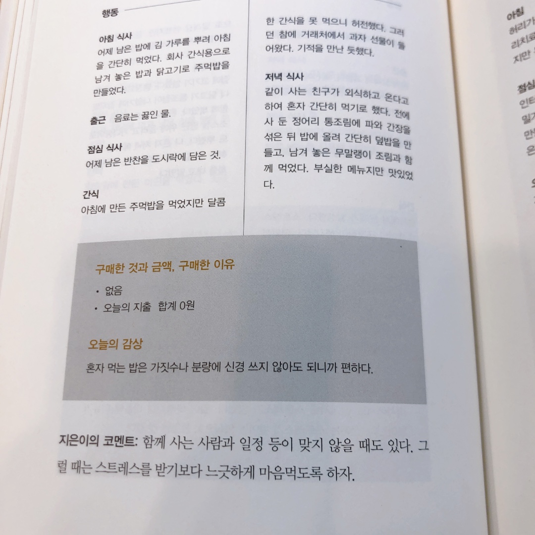 꼭 필요한 물건만 구매해서 사는 습관, 그전에 우리 집에 있는 쓸모없는 물건을 정리하는 게 우선인 거 같다는 생각이 드는데요. 이 책을 이후로 이틀정도는 집안의 식재료로 음식을 해서 건강한 한 끼 밥상을 매 끼니마다 먹고 있는데 이것만이라도 큰 변화가 생긴 거 같은 느낌이 들어요.