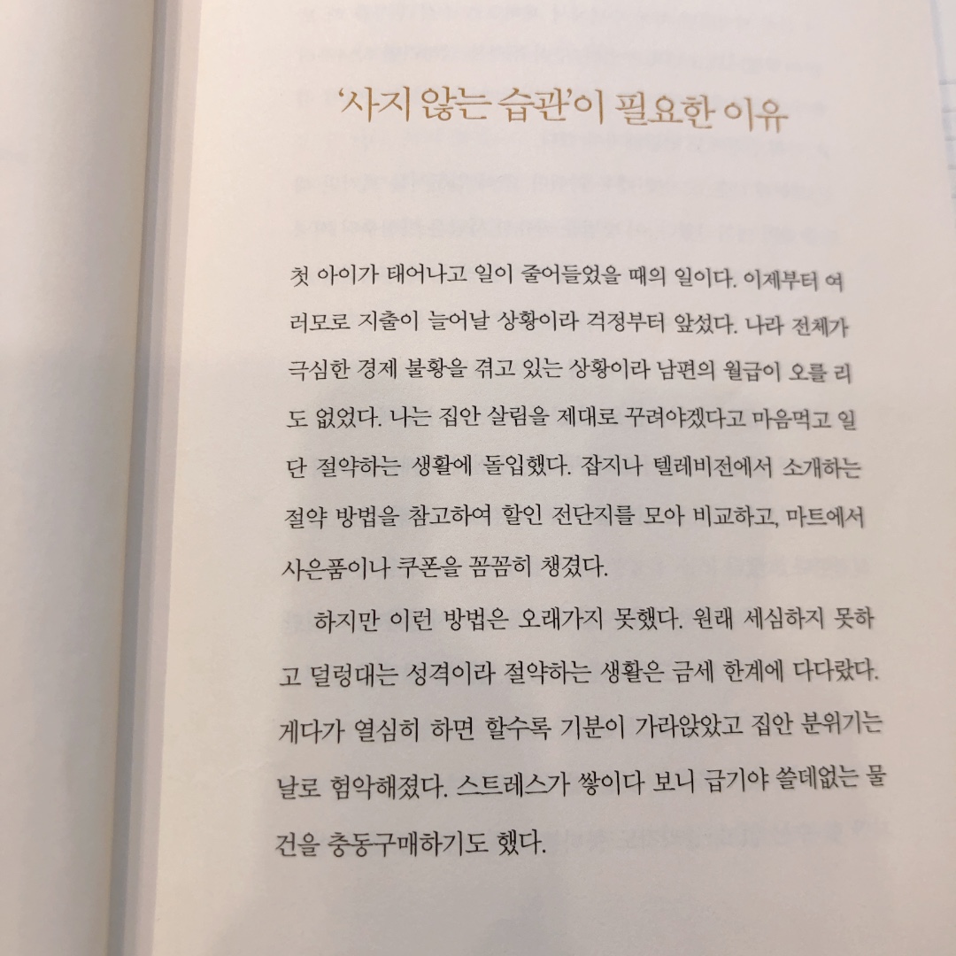 더 나아가 매일 한 공간씩 정해 물건을 정리하고 불필요한 물건은 중고마켓에 판매해서 깨끗하게 정리해 나가는 게 사지 않는 습관을 위한 한걸음이라는 생각이 드네요. 가볍게 읽기 좋은 책으로 추천드릴게요 :)