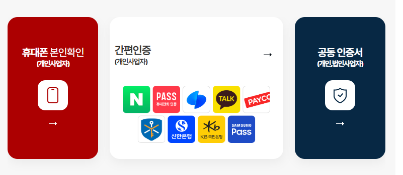 - 개인사업자: 휴대폰 본인확인 및 간편 인증, 개인 공동인증서