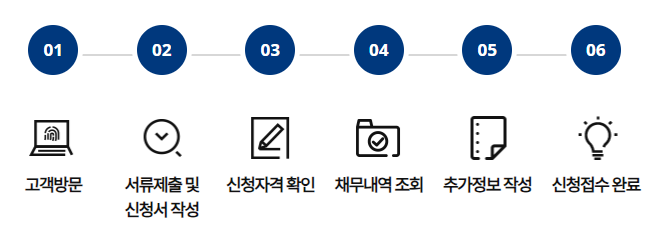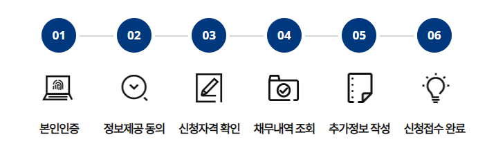본인인증-정보제공동의-신청자격확인-채무내역조회-추가정보 작성-신청접수 완료됩니다. 긴급고용안정지원대상자(특수고용근로종사자나 프리랜서)의 경우, 상담창구에서 신청이 가능합니다.