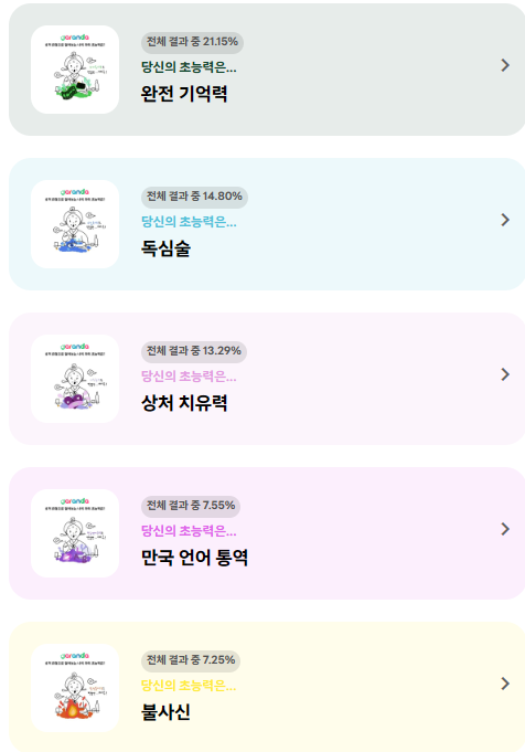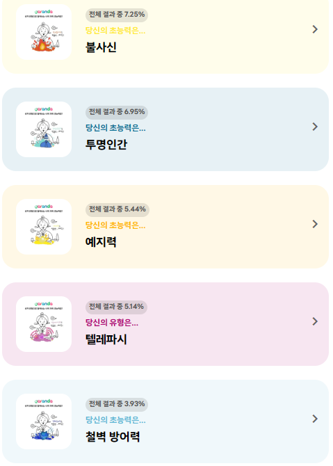 여러 초능력이 있는데 전체 결과 중 현재 기준 저의 초능력 투명인간은 6.95%네요.!