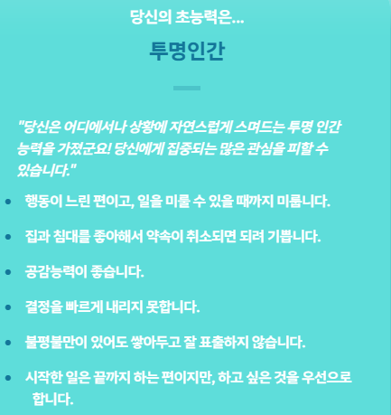 제 초능력은 투명인간이라고 하네요. 오호호 재밌는 결과인데, 제 초능력은 반은 맞고 반은 틀린 거 같아요.