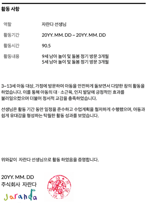 자란다는 활동경력증명서라는 서류가 있어서 취업할 때 지원하는 기업에 신뢰도 얻을 수 있고 활동증명서에 활동기간, 활동시간과 내용도 나와 있어서 내가 아르바이트를 통해 얻은 경험이 무엇인지 상세하게 한눈에 알아볼 수 있어서 참 좋은 거 같아요.