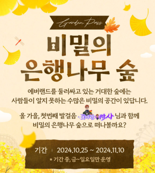 '비밀의 은행나무숲 산책' 프로그램은 10월 25일부터 11월 10일까지 매주 금, 토, 일요일에 진행됩니다. 총 9일 동안 하루 3회씩 진행되며, 1회당 최대 30명까지 참여할 수 있습니다. 예약은 10월 18일부터 에버랜드 앱의 스마트예약을 통해 선착순으로 가능합니다. 이 특별한 프로그램에 참여하고 싶다면 미리 예약을 하는 것이 중요합니다.