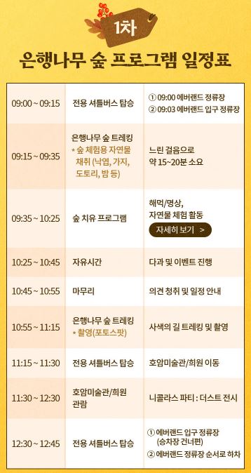 프로그램에 참여하기 위해서는 에버랜드 정류장에서 출발하는 전용 셔틀버스를 이용해야 합니다. 셔틀버스는 에버랜드 입구정류장, 신원리 은행나무 숲, 호암미술관 삼거리로 이동합니다. 약 15분간의 이동을 거쳐 신원리 은행나무 숲에 도착하게 되며, 이후 왕복 약 2㎞의 은행나무길을 따라 트레킹을 즐길 수 있습니다.