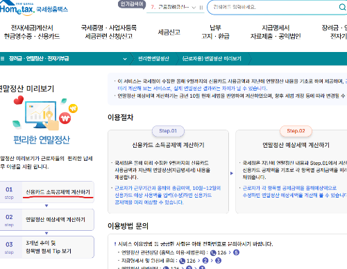 탭을 눌러 들어가면 왼쪽 하단에 step01 '신용카드 소득공제액 계산하기'에 마우스를 갖다대면 버튼을 누를 수 있게 표시가 됩니다. 버튼을 눌러주세요.