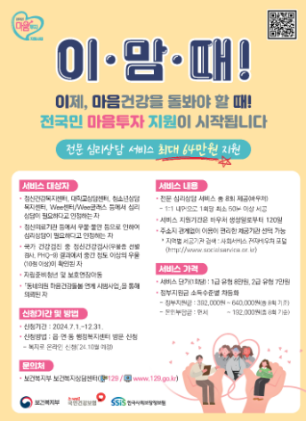 전국민투자지원사업: 우울, 불안 등 정서적 어려움이 있는 국민에게 심리상담 서비스를 제공하여, 국민의 마음건강 돌봄 및 정신질환 사전 예방 조기발견을 위한 사업이다. 전국민투자지원사업은 7월부터 시행 됩니다.