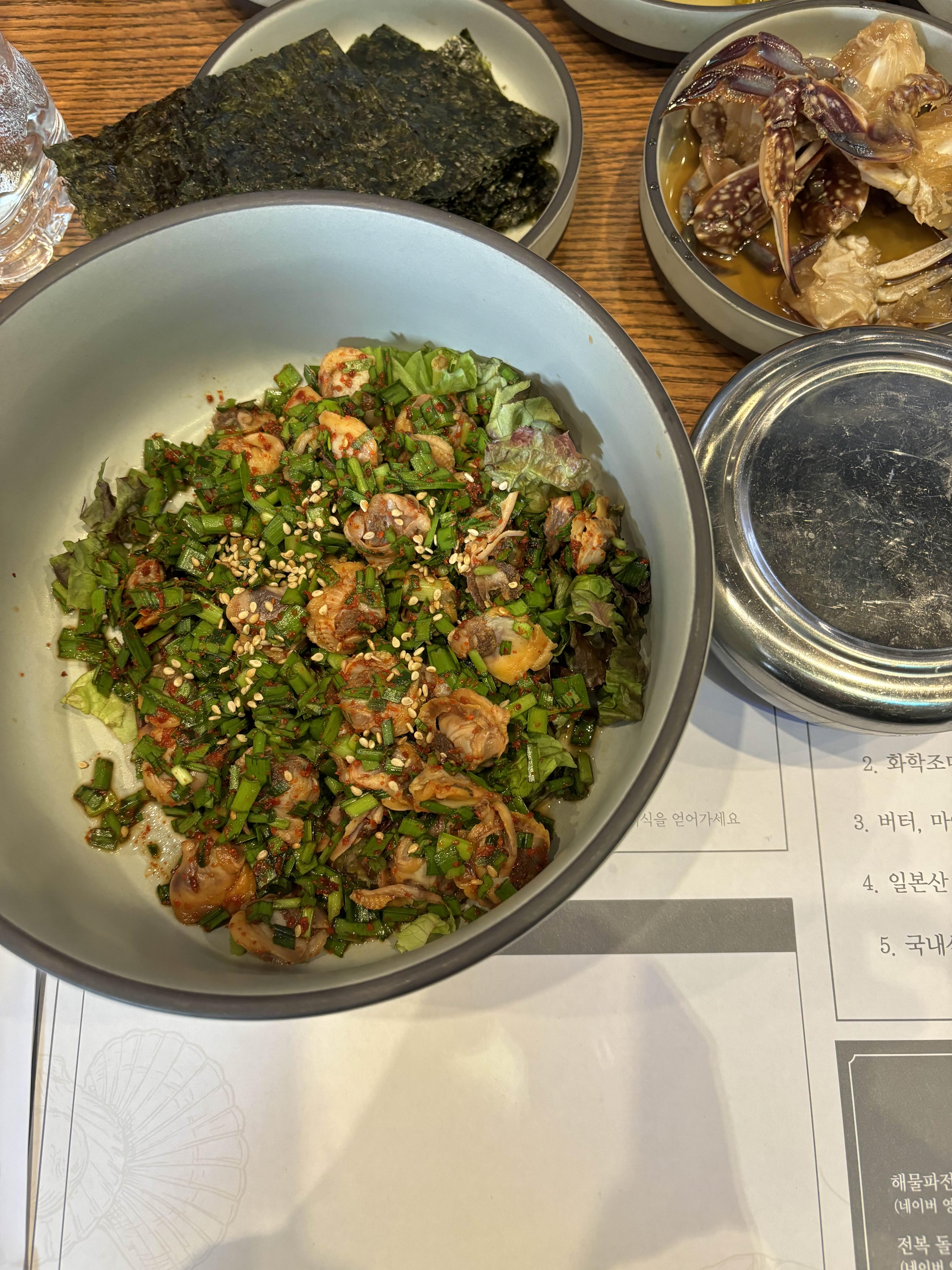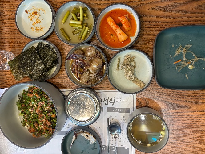 저는 꼬막비빔밥을 주문했는데 여러 밑반찬들이 먼저 나왔어요. 밑반찬은 셀프바에서 무한으로 가져다 먹을 수 있는데 간장게장이 밑반찬이라니 너무 좋았네요