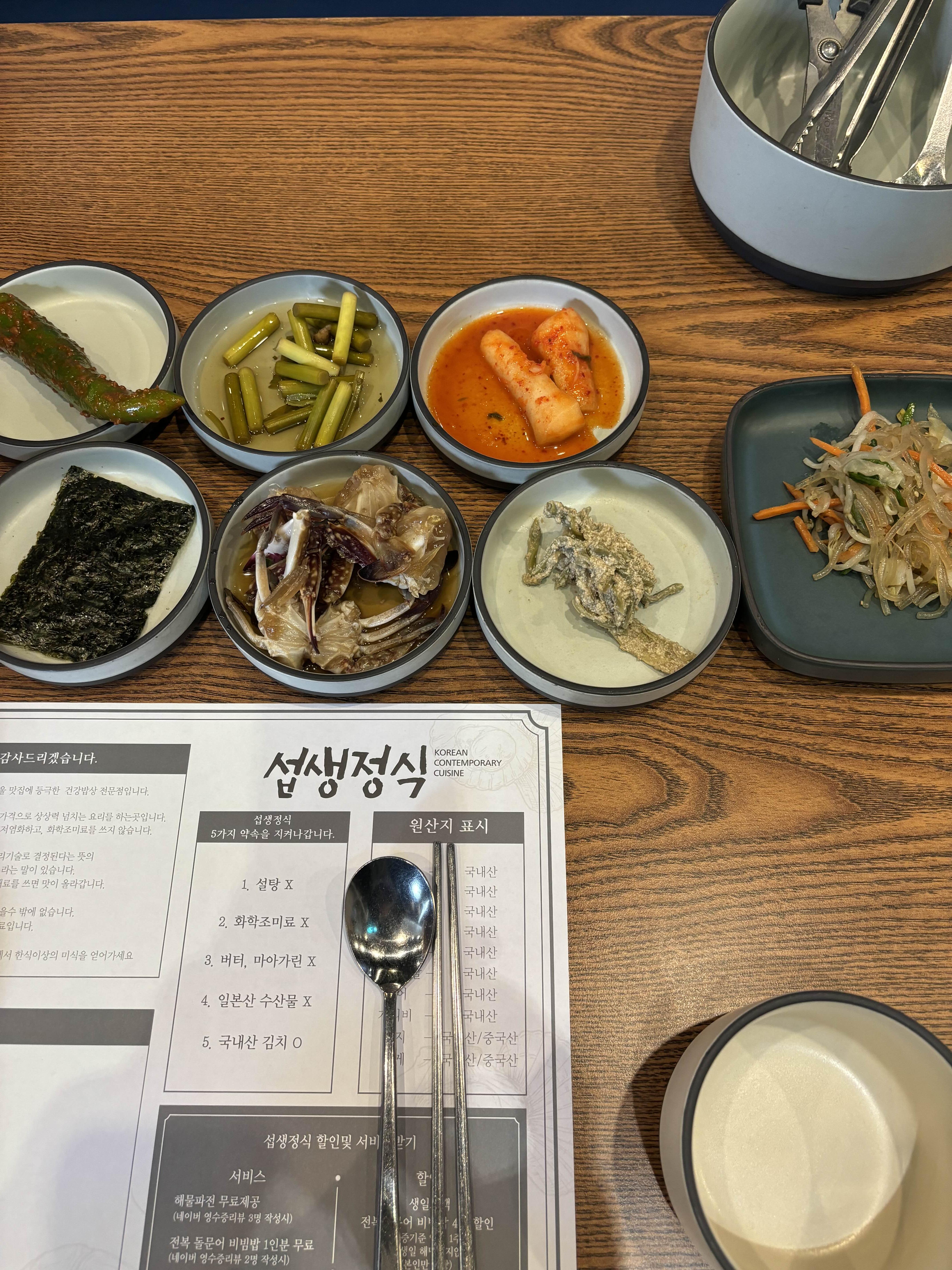 섭생정식은 설탕이나 화학조미료 버터 마가린 일본 수산물은 사용하지 않고 국내산 김치 그리고 좋은 재료들로 음식을 만든다는 슬로건을 가지고 건강한 이미지를 내세우고 있는 곳이었어요.