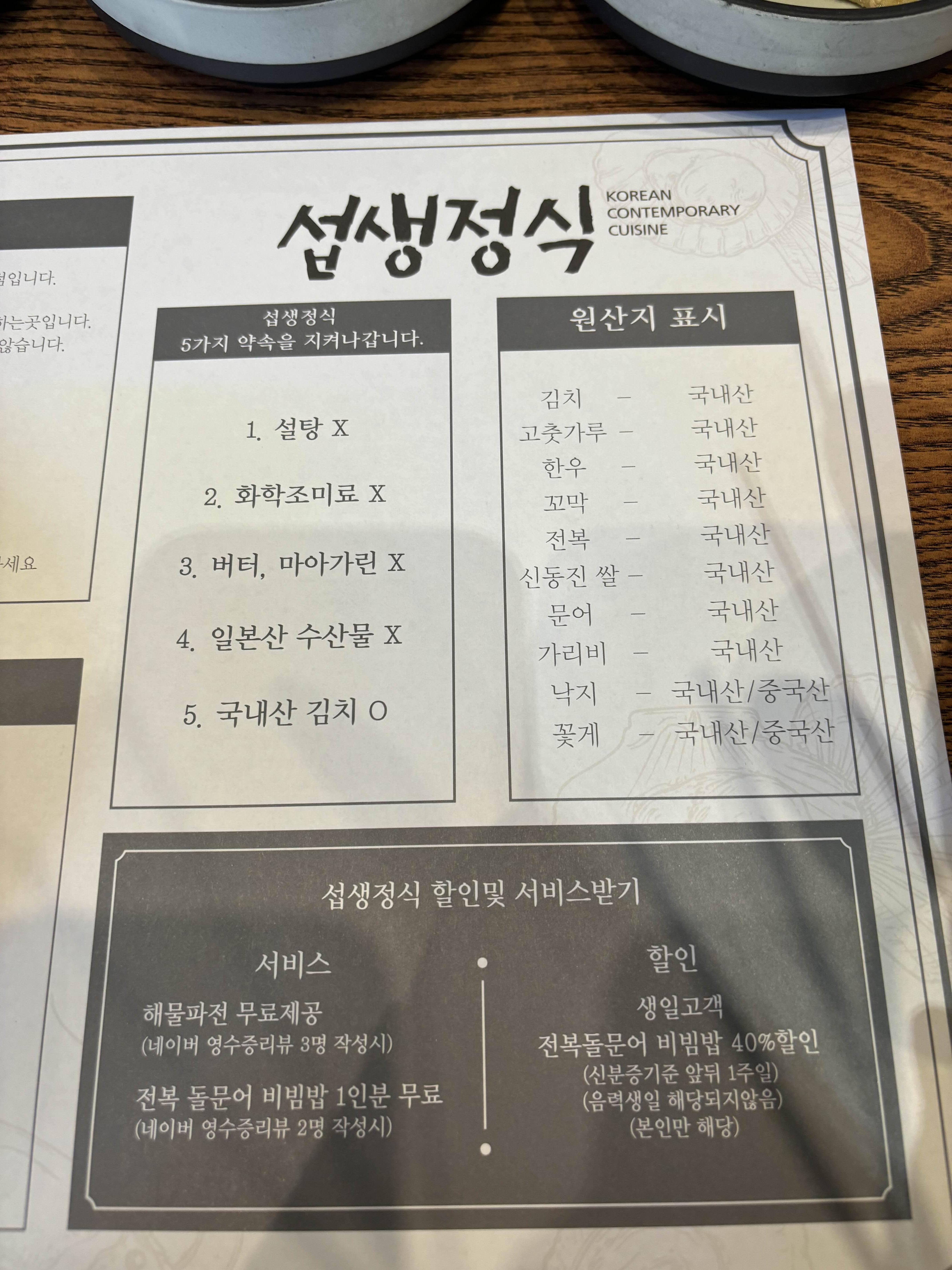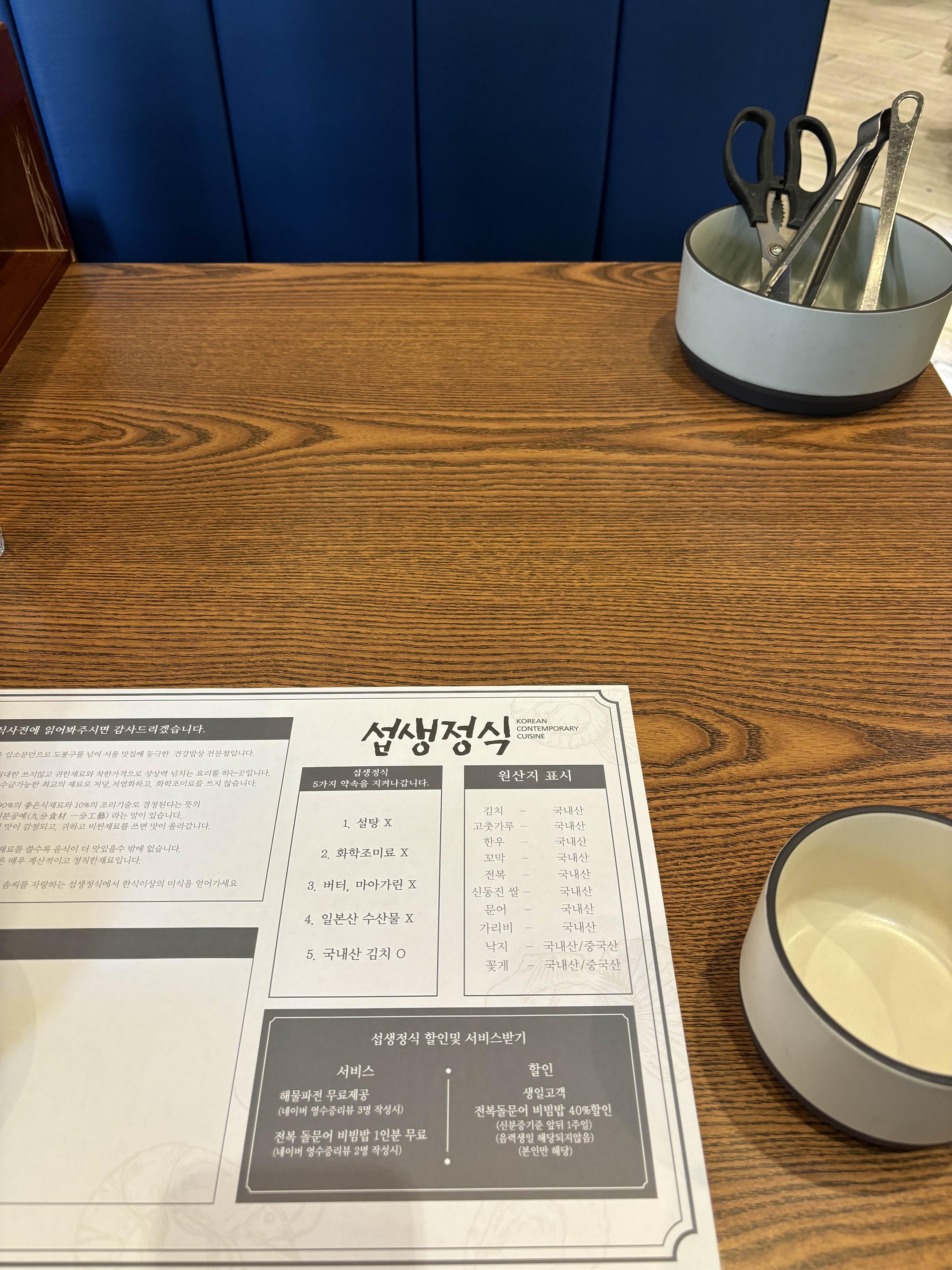 섭생정식은 설탕이나 화학조미료 버터 마가린 일본 수산물은 사용하지 않고 국내산 김치 그리고 좋은 재료들로 음식을 만든다는 슬로건을 가지고 건강한 이미지를 내세우고 있는 곳이었어요.