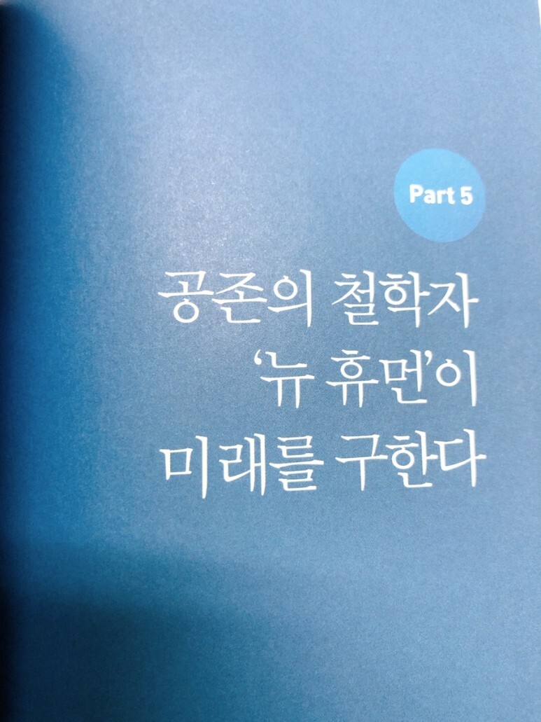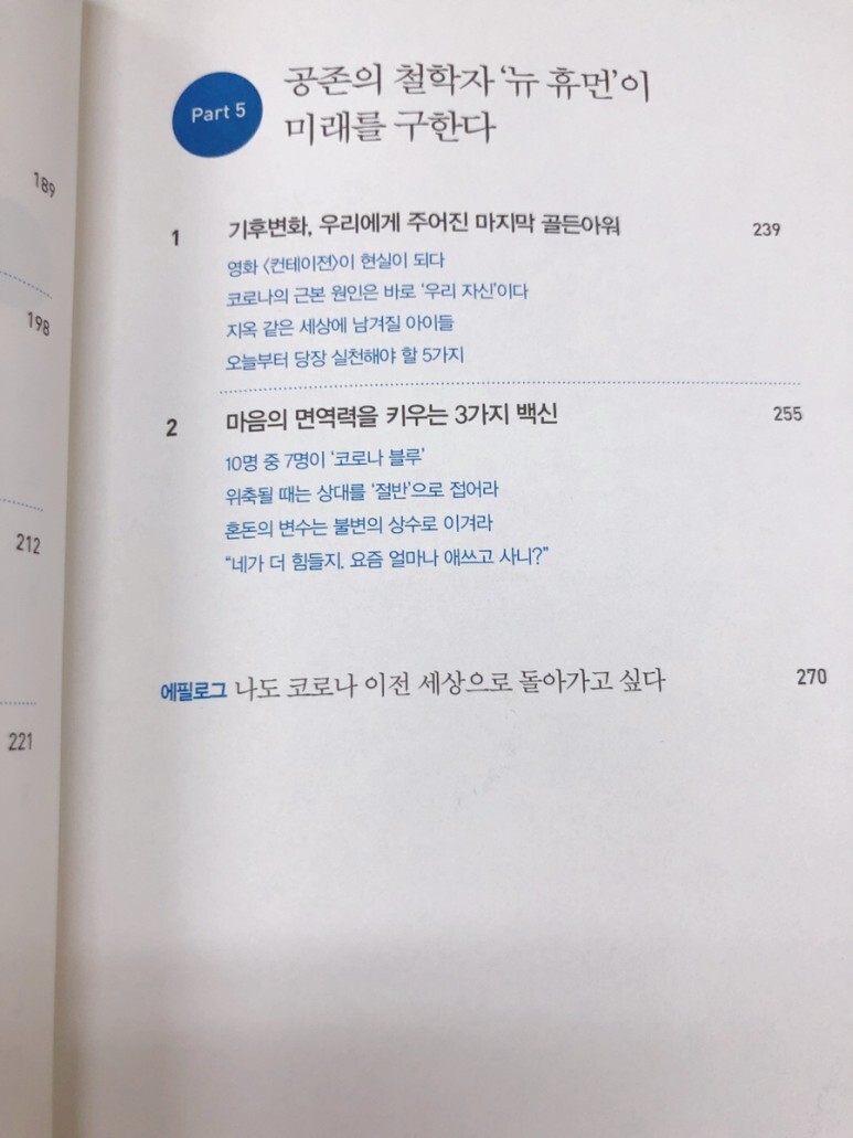 마지막 장 PART5 공존의 철학자 '뉴 휴먼'이 미래를 구한다. 기후변화와 환경오염으로 인해 이제 코로나와 같은 전염병이 더 많아지면 많아지지 적어지지 않는다는 사실. 실제 많은 전문가들의 예측도 그러하다고 하니 마지막 장을 읽는 내내 조금 무섭다는 생각이 들면서 나도 내가 할 수 있는 영역에서 지구를 아끼고, 미래 후손들에게 좋은 것들을 남겨줄 수 있는 행동, 습관들을 해나가야겠다고 생각했어요.
