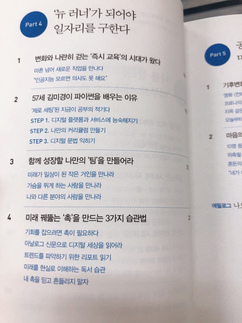 책의 큰 파트는 총 다섯 가지로 나누어져 있는데 그 첫 번째 파트가 대전환을 두려워하지 말자는 Part 1입니다. 코로나로 인해 변화가 가속화되면서 우리는 사람과 쉽게 만나지 못하고 온택트로 모든 것이 전환되면서 이러한 세계에 적응해나가는 것들을 두려워하지 말라는 이야기들을 주로 다루고 있어요.