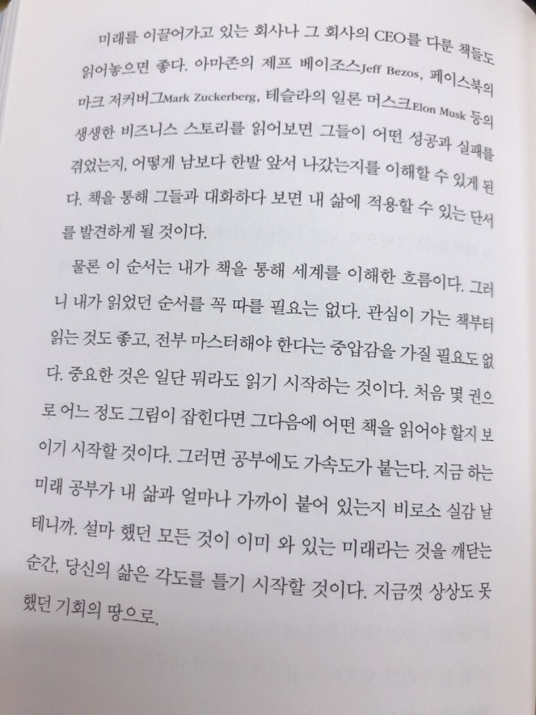 책을 통해 성공을 이룬 사람들과 대화하다 보면 내 삶의 단서를 찾을 수 있다고 하는데 저도 책을 읽으며 내 삶에 어떤 걸 적용해야 하는지 많은 부분을 고민하게 된다는 것에 동의합니다. 뭐라도 읽기 시작하는 것. 참 어렵고도 쉽다고 할까. 지금은 어느 정도 책을 읽다 보니 어느 방향성으로 책을 읽어야 하는지 저도 각도가 기울어지고 있는 것을 느끼고 있어요.