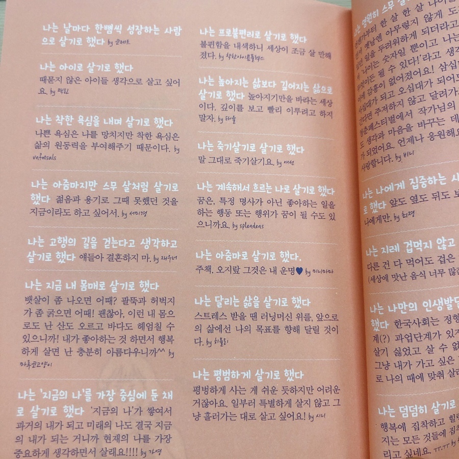 나는 _____로 살기로 했다. 블랭크를 스스로 생각해 볼 수 있도록 하는 글귀가 나오면서 책은 마무리됩니다. 가볍게 읽기 좋은 책. 그리고 인간관계가 힘들거나 잘 살아가고 있을까라는 생각이 들 때 꺼내보면 좋을 책인 것 같아요.