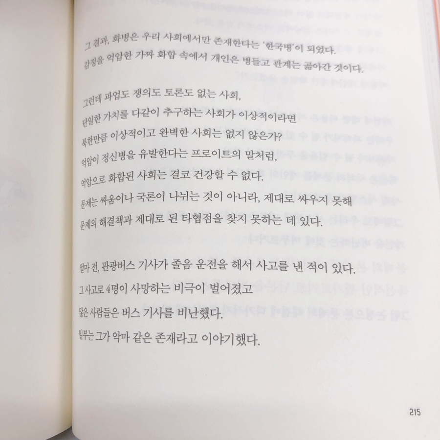 화병은 우리 사회에서만 존재하는 한국병이 되었다고 표현하는 저자. 감정을 억압하는 가짜 화합 속에서 단일한 가치를 다 같이 추구하는 사회. 이 글을 보니 신입사원일 때 제 모습이 떠올랐어요. 회사에 첫 입사 후 팀원들과 카페에 갔는데 팀장님이 먹고 싶은 음료를 고르라고 해서 먹고 싶은 걸 골랐는데 다른 선배 직원들이 저에게 신입사원 답다며 얘기하던 상황. 제가 다른 직원들이 고른 아이스 아메리카노를 골라야 했던 걸까요? 제가 정말 좋아하지 않는 비효율의 사회. 감정이 격양돼도 안되지만 감정을 억압하는 것도 개인을 병들고 곪아가게 한다는 것. 그 당시 사회생활하면서 사람들과 섞여 있으면서도 이성과 감정을 적절하게 섞어서 나의 감정을 올바르게 표현할 수 있는 힘을 기를 수 있도록 나의 기준을 잃지 않으려고 애썼던 것 같아요.