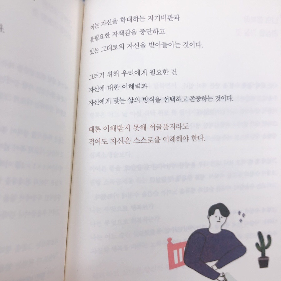 나는 _____로 살기로 했다. 블랭크를 스스로 생각해 볼 수 있도록 하는 글귀가 나오면서 책은 마무리됩니다. 가볍게 읽기 좋은 책. 그리고 인간관계가 힘들거나 잘 살아가고 있을까라는 생각이 들 때 꺼내보면 좋을 책인 것 같아요.