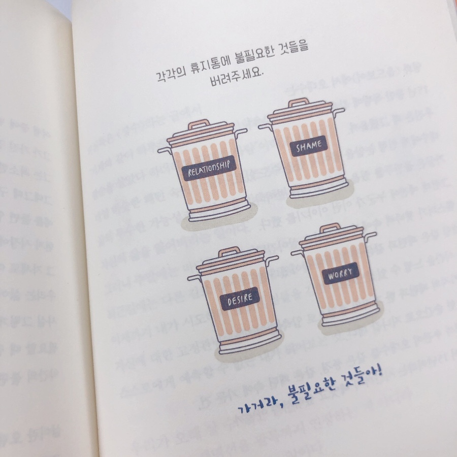 불필요한 것들. 책 속의 휴지통을 보며 머릿속에 떠오르는 것들을 비워내 보았어요.