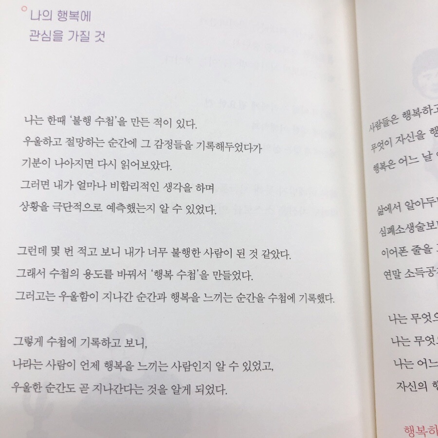책을 읽는 내내 공감 되는 부분이 많았는데, 우울하거나 기분이 좋지 않을 때 저자가 불행 수첩을 만들어 그 감정들을 기록했다는 내용이 있어요. 저 또한 매일의 기록을 하진 않아도 최근 들어 일상 기록을 자주 하면서 저를 객관화할 수 있다는 것이 메모에 좋은 점이라는 걸 알 수 있었어요. 알고는 있었지만 실천하진 않았는데 최근에 실천하게 된 일을 글로 마주하니 더 반가웠네요.