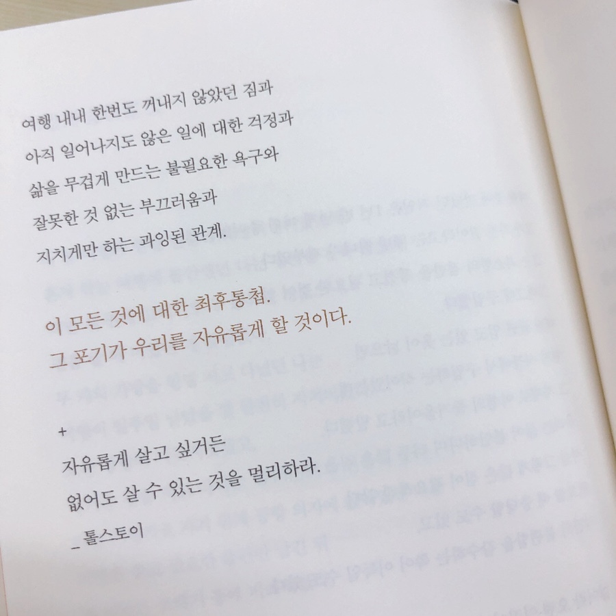 여행 내내 한 번도 꺼내지 않던 짐을 챙겼던 저는 이제 조금씩 덜어내는 연습을 하기로 반성합니다. 자유롭게 살고 싶거든 없어도 살 수 있는 것을 멀리하라는 톨스토이의 말처럼 저도 그렇게 살고 싶네요. 현실에 당장 반영하기 쉽지 않지만요.
