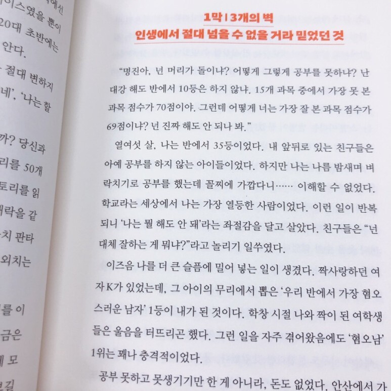 외모도 꼴찌 성적도 꼴찌 돈도 꼴찌. 자청에게는 3개의 벽이 있었다고 해요. 책에서 3개의 벽을 하나씩 깨 나가는 저자의 업그레이드되는 모습을 상세하게 읽을 수 있었어요. 그 방법은 바로 '책 읽기' 였어요.