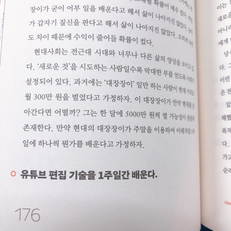 유튜브 기술을 배운다든지 아니면 쿠팡 판매자가 되거나 온라인 마케팅 수업을 일주일 간 배우는 것. 나만의 타이탄의 도구들을 만들라고 이야기하는데 이 부분은 성공한 사람 대부분이 언급하는 내용이에요. 이 책을 읽고 유튜브를 오늘까지 아무거나 하나 업로드해 보는 게 목표였는데 글쓰기와 독서 외에 아직 유튜브는 실행을 하지 못했네요. 반드시 다음 주 안으로 업로드해 보는 걸로 :)