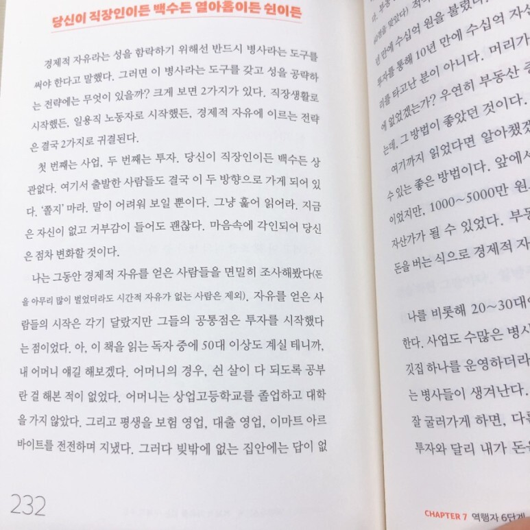 자청은 순리자의 삶 대신 역행자의 삶을 살아야 성공할 수 있다고 책에서 이야기하고 있는데 역행자가 되는 방법을 7단계에 거쳐 방법론 적으로 설명하고 있어요. 대부분의 책이 흐름을 이야기하고 있다면 이 책은 흐름과 더불어 방법론까지 제시한 책이라고 할 수 있겠네요.
