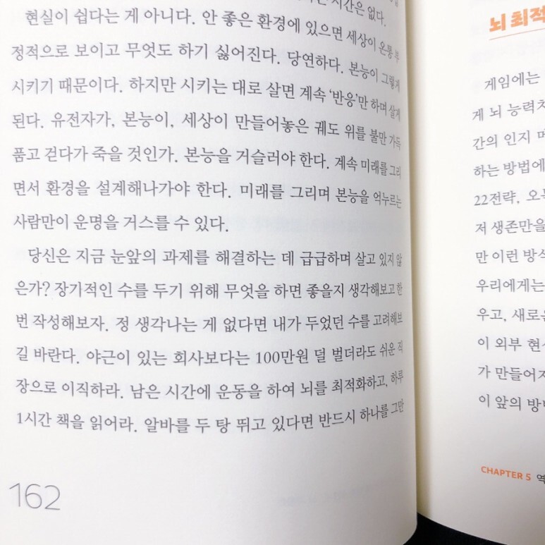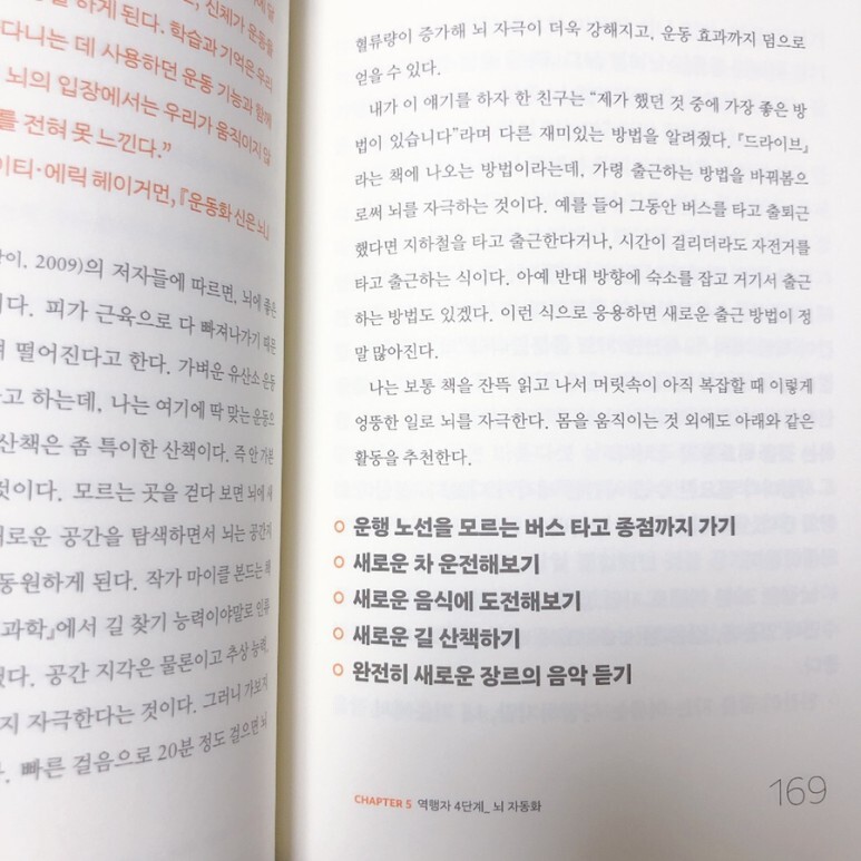 뇌 자동화를 위해 힘쓰는 법. 책에서 안 쓰던 뇌를 자극하고 뇌를 최적화하는 방법을 3단계로 나누어 설명하고 있는데 앞서 말했듯이 역행자는 방법론에 입각한 사례를 바탕으로 한 자기 계발 실전서 같은 느낌이 들었어요.