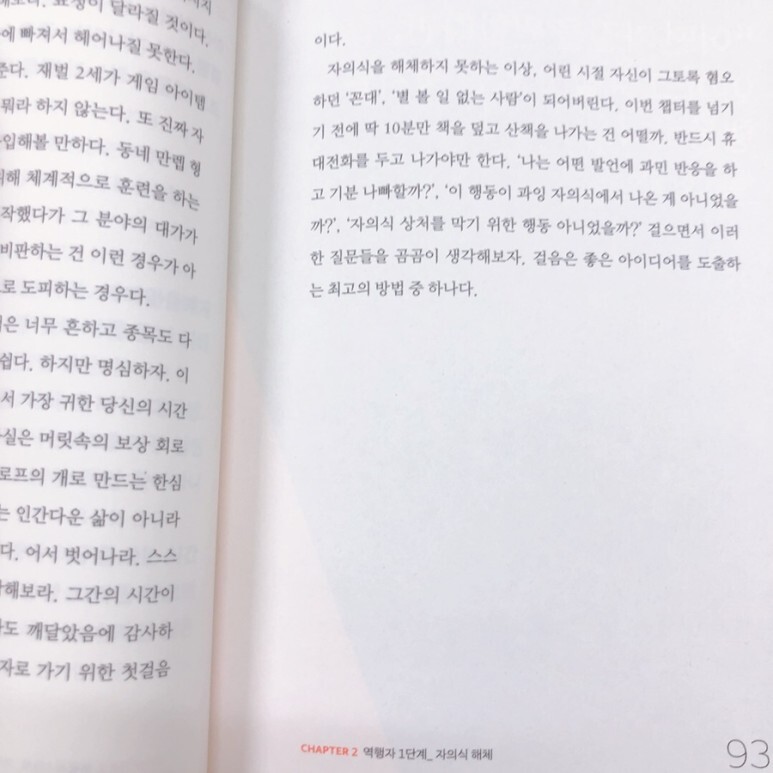 자의식 해체의 중요성을 강조하고 있는 저자. 평소에 우리는 이런저런 이유로 '나는 ~해서 안 돼'. '그건 공부 잘하는 사람이나 하는 거지'라는 말로 한계를 정해서 스스로 합리화를 하고 있진 않았는지 질문을 던지고 있어요. 저에게 이 내용을 적용했을 때 나는 체력이 안된다는 이유로 여러 가지 일을 크게 하지 못한다고 나의 한계를 정해버리진 않았나라는 생각을 했어요.