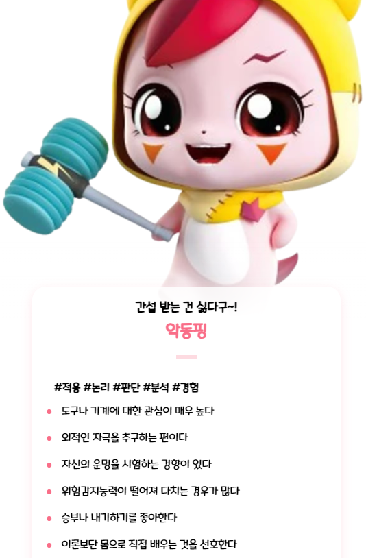 티니핑은 최근 미취학 아동부터 초등학교 저학년 사이에서 폭발적인 인기를 얻고 있는 만화 캐릭터입니다. 이 사랑스러운 캐릭터들은 아이들에게 큰 사랑을 받고 있으며, 이를 통해 학습과 소통의 도구로 활용되고 있습니다. 특히 티니핑 테스트는 자녀와 함께 진행하기에 적합한 MBTI 유형 테스트 중 하나로, 자녀의 성향을 이해하는 데 도움을 줄 수 있습니다. 저는 아래와 같이 악동핑이 나왔는데요. 생각보다 티니핑 테스트가 MBTI랑 정확도가 높아서 놀랐어요. 아이들이 좋아하는 티니핑 캐릭터이기 때문에 가족끼리 재미로 해봐도 좋을 것 같은 테스트입니다.