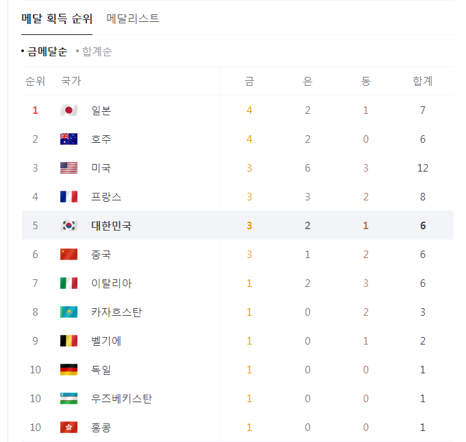 우리나라가 7월29일 기준 메달 획득 순위가 5위로 확인됩니다. 사격, 펜싱, 양궁 등에서 좋은 결과를 얻으며 메달 획득 순위가 5위까지 올랐습니다.