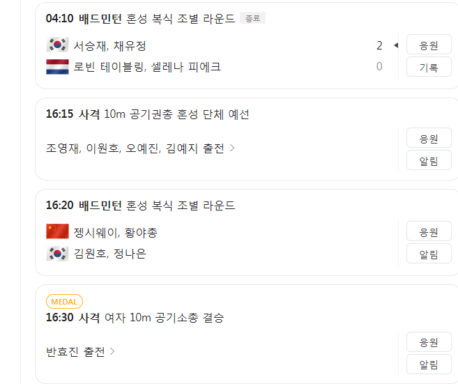 7.29일 오후부터 배드민턴 혼성경기와 사격, 펜싱, 유도까지 다양한 경기가 펼쳐질 예정입니다. 오늘 메달이 달린 사격경기도 두 개나 있으니 사격경기를 챙겨보시는 걸 추천드릴게요.