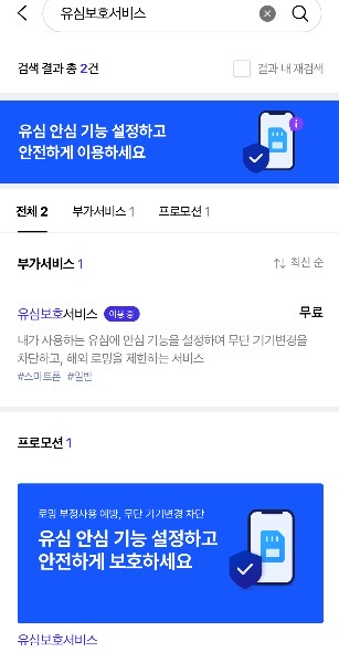 앱에서 찾고 싶다면 앱 로그인 후 돋보기에 유심보호서비스를 검색하면 바로 창으로 이동할 수 있습니다. 그리고 가입을 누르면 위와 같이 해지 버튼이 생기면 가입이 정상적으로 된 것을 확인할 수 있습니다.