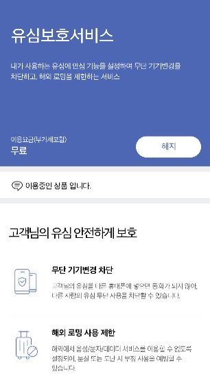 앱에서 찾고 싶다면 앱 로그인 후 돋보기에 유심보호서비스를 검색하면 바로 창으로 이동할 수 있습니다. 그리고 가입을 누르면 위와 같이 해지 버튼이 생기면 가입이 정상적으로 된 것을 확인할 수 있습니다.